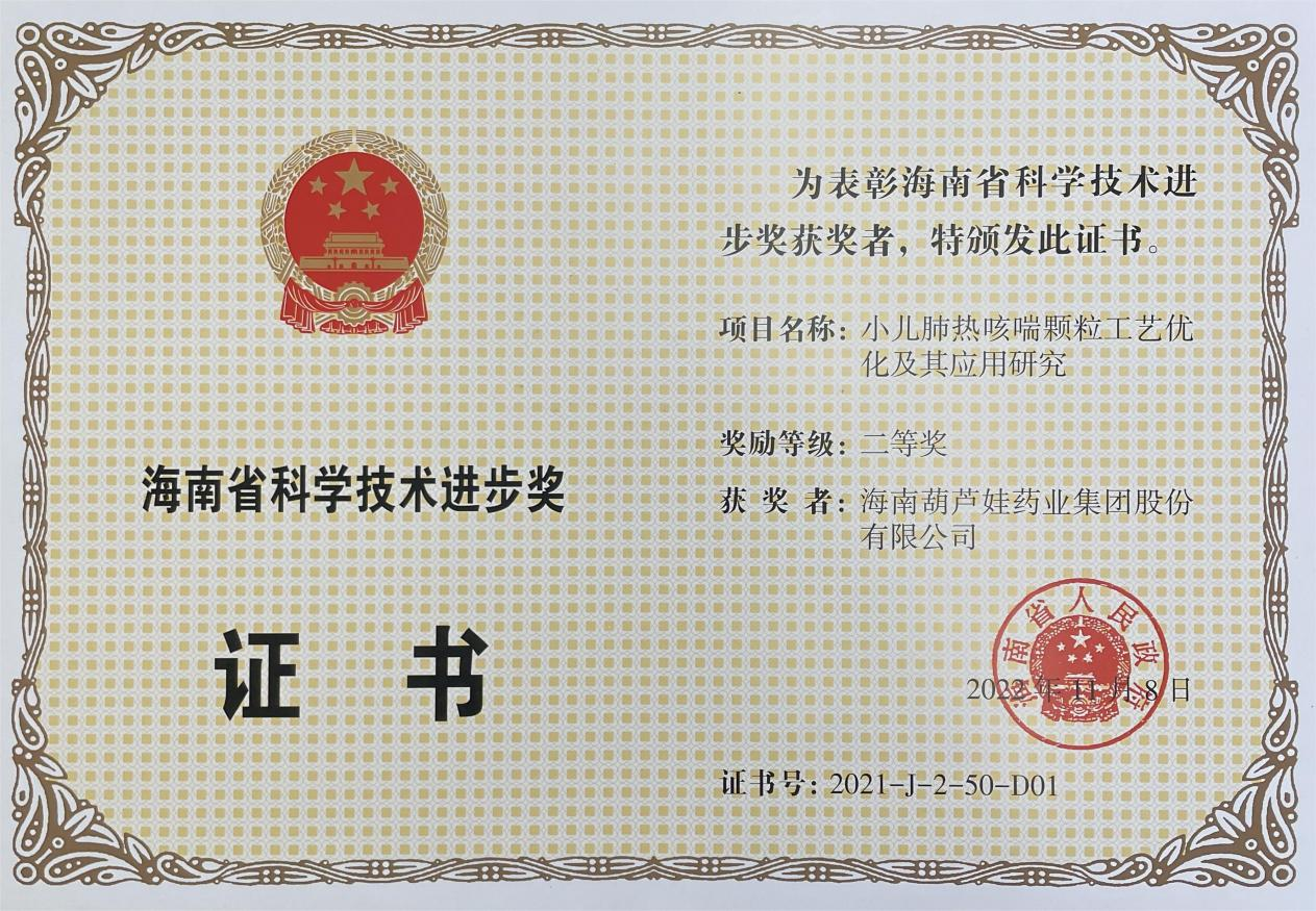 为此,小儿肺热咳喘颗粒的制备方法获得了第二十一届中国专利优秀奖(2019年),专利申请号:ZL201010134951,此次作为专利技术的应用,获得了2021年度海南省科学技术进步奖二等奖。在此之前,PA尊龙时凯牌小儿肺热咳喘颗粒还多次被授予“临床价值中成药品牌”、“中国连锁药店最具合作价值单品”,荣登“中国医药品牌榜”。